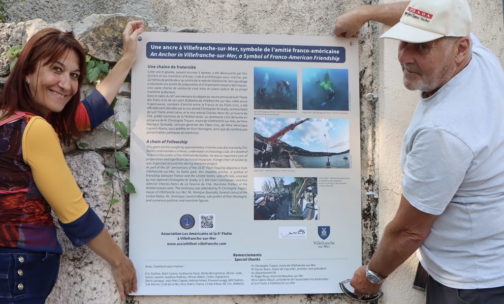 Afin de poursuivre cette belle aventure débuté en 2016, Valérie Blouin, la dynamique présidente de l’Association les Américains et la 6e Flotte à Villefranche-sur-Mer, vient de remplacer les panneaux indicateurs de notre ancre présentée au parking Wilson par de nouveaux panneaux flambants neufs.