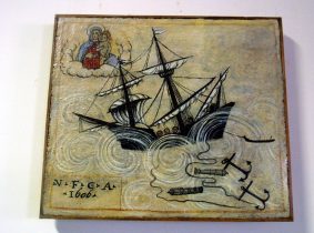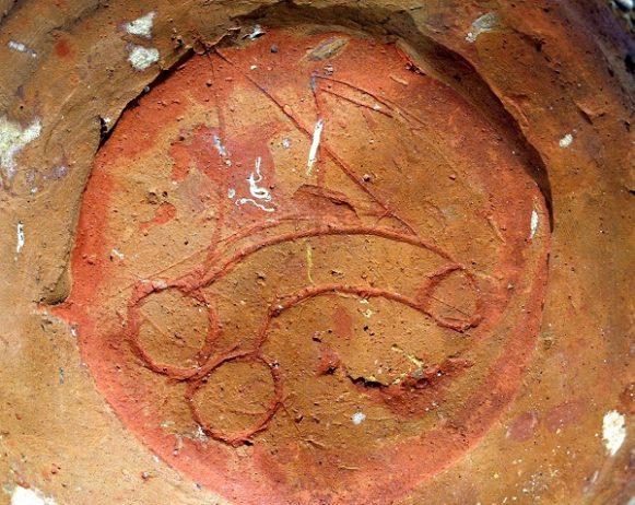 Un beau phallus surmonté d’une voile latine gravés sur le revers d’un plat produit dans la vallée de l’Huveaune au 18e siècle